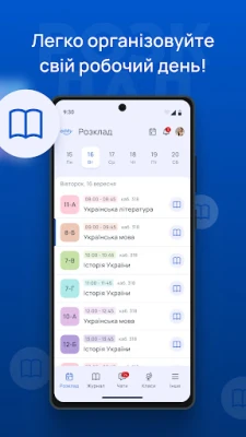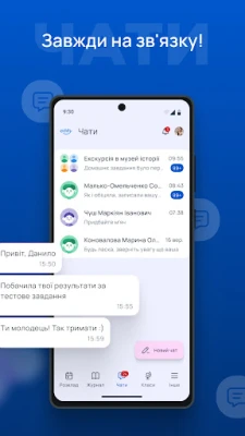 • Спілкуватися з колегами, учнями та батьками у зручному чаті — завжди на зв’язку!