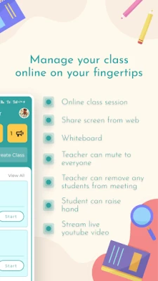 • Online classroom: Teacher can start online class with single click. Up to 70 students can join class