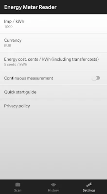 Want to know what is your household's electricity consumption at the moment? Energy Meter Reader application tells it. Electricity consumption is calculated from energy meter's blinking LED light, using your phone's camera. If you have set energy cost per kWh to settings, you also get daily cost of your household's electricity consumption. With Energy Meter Reader application you are able to compare how much electricity consumption changes when different electrical equipment / household lighting are on or off.