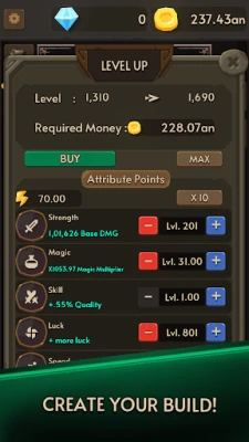 Bir RPG gibi, üretiminizi ve saniye başına kazancınızı optimize etmek için farklı yapılar oluşturun. Hiçbir sınırlama olmadan istediğinizi satın. İstediğiniz gibi büyütün; Burada tek sınırınız hayal gücünüz! Ve sonra yapılarınızı gerçek zamanlı boşta savaşlarda test edin!
