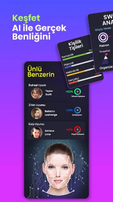 Yüz tanıma ile özel analizler, Johnny Depp veya Taylor Swift gibi hangi ünlüye benzediğinizi hiç merak ettiniz mi? Daha fazla aramayın! FaceLord, kişilik, kişilik türleri, karakter özellikleri, aşk uyumu, burç uyumu gibi alanlarda derinlemesine içgörüler sunan, sıradanın ötesinde bir dizi ileri düzey yüz tanıma ve ses analizi sunar. Kişilik türünüzü, Enneagram Türleri veya 16 Kişilik gibi keşfedin ve narsisizm ve sosyopati gibi özellikler hakkında değerli bilgiler edinin.