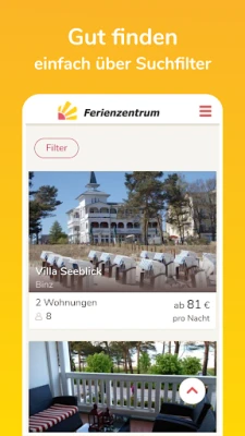 Zimmer frei? - Ferienwohnungen & Ferienhäuser für den Urlaub in Deutschland und Europa finden Sie jetzt auch unterwegs mit der Ferienzentrum App. Die Unterkünfte werden mit Fotos, aktueller Freimeldung und Mietpreisen präsentiert.