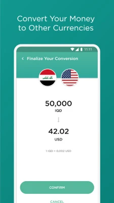 Money conversion. Do you want to store and spend your money in different currencies? With First Iraqi Bank you can easily convert your money between IQD, USD, and EUR.
