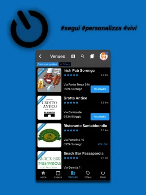 Firstoff, find your event. The social network to discover places and events. • Set your interests, we will find targeted content for you. • Follow the venues you like the most, by activating the notifications you will see their new events, menus and offers in real time. • Request the voucher-code in one of the affiliated venues to activate your personal FirstoffCard, you will now get discounts and offers in all Firstoff venues!