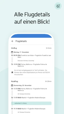 Nach der Auswahl des gewünschten Flugs werden Ihnen alle wichtigen Details (z.B. Preise, Flughäfen, Flugplan, Flugdauer, Datum etc.) übersichtlich angezeigt. Nun können Sie problemlos Ihren günstigen Flug direkt über Ihr Smartphone buchen.
