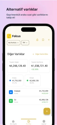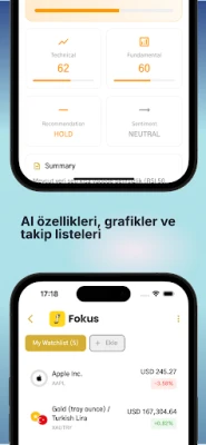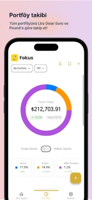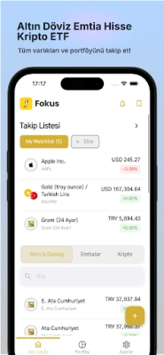 Fokus ile yatırım portföyünüzü profesyonel seviyede takip edin. Altın, döviz, kripto para, hisse senetlerinin ve Amerikan ETF ve hisslerin fiyatlarını izleyin, portföy analizi yapın ve AI (yapay zeka) özelliklerini kullanın.