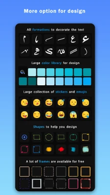• Tasarımcı programı, tek bir tıklamayla resimlere ekleyebileceğiniz güzel yazı tipleriyle yazılmış İngilizce alıntılara, hazır cümlelere ve ifadelere ek olarak geniş bir Arapça alıntı koleksiyonu içerir.