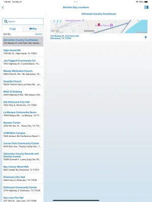 The GalvestonVotes App provides information on election dates and times; interactive maps showing voters their nearest Voting Location along with directions on how to get there; and information on countywide voting, ID requirements, and how to contact Galveston County Elections. There are also sample ballots, an election calendar, and election return information on Election Night.