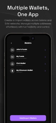 Desteklenen zincirlerde birden fazla cüzdan oluşturun veya mevcut cüzdanlarınızı içe aktarın. Her cüzdan, Solana, Ethereum, XRP ve BNB Akıllı Zincirinde düzenli ve esnek varlık yönetimi için birden fazla adrese sahip olabilir.