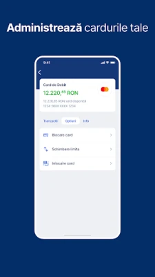 • Administrare carduri: blocare/deblocare instantă și vizualizarea detaliilor în siguranță.
