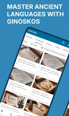 Ginoskos öğrenme uygulaması ile eski İncil dilleri Yunanca (Koine) ve İbranice'yi öğrenin. İncil çalışmaları için gerekli olan Aramice ve Latince'yi de öğrenin.