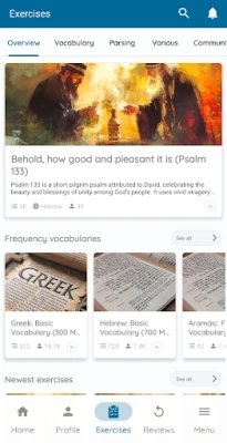 Ayrıca, hem Yunanca hem de İbranice için en çok geçen kelimelerden daha azına kadar sık kullanılan kelimeleri öğrenmek için özel alıştırmalar vardır. Belirli pasajların ve ayrıca tüm İncil kitaplarının kelime hazineleri vardır.