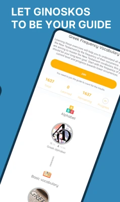 Ginoskos, çeşitli alıştırmalar sunarak kelime dağarcığınızı geliştirmenize yardımcı olur. Hem kelime hem de dilbilgisi eğitimi alabilirsiniz. Bir alıştırma yapmaya başladığınızda Ginoskos öğrenme ilerlemenizi izleyecek ve daha önce öğrenilmiş öğeleri kademeli olarak gözden geçirmenizi sağlayacaktır (uygulama unutma eğrisi bilgisini yansıtır).