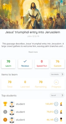 - Kelime rehberleri: birbiriyle ilişkili alıştırmaları öğrenmenize yardımcı olur (frekans kelimeleri, İncil'deki yaratılış bölümleri, ilahiler vb. gibi)