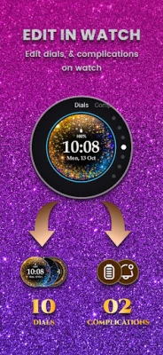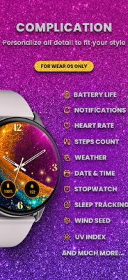 Set your favorite Glitter Watchface effortlessly and turn your wrist into a statement of style and sophistication. Make every glance at your watch vibrant and glamorous!