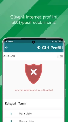 • Güvenli İnternet hizmeti hakkında bilgi alabilir; profilinizi aktif/pasif duruma getirebilir veya profiller arasında geçiş yapabilirsiniz.