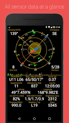 GPS algılayıcı bilgisi gösterir : uydular için pozisyon ve sinyal kuvveti, doğruluk, hız, hızlanma, rakım, yataylık, dikeylik ve batarya durumu.