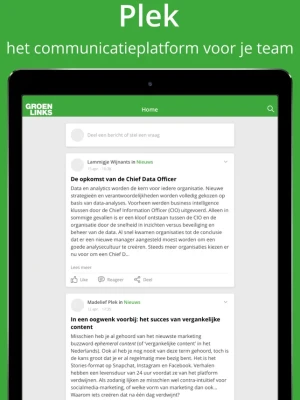 Dit is GroenLinks’ Plek. Simpel in gebruik, snel, slim en veilig. Een sociaal platform met alle essentiële functionaliteiten: nieuws, profielen, groepen, berichten, kalenders, documenten en chat. Hier blijf je op de hoogte van het interne nieuws binnen GroenLinks.