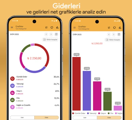 Paranızın nereye gittiğini anında görebileceğiniz sezgisel grafiklerle finansal durumunuzu analiz edin.
