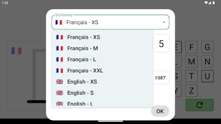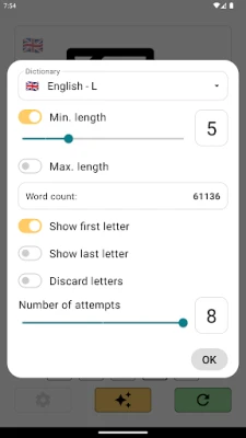 No ads, and several options: - choose your word lists (small list of simple words, or large list with all the words) - select the minimum and maximum word length - choose the number of attempts allowed, etc.