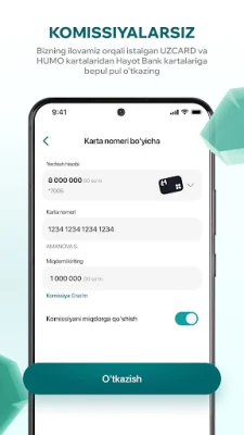 - Istalgan UZCARD va HUMO kartalaridan bizning bank kartalarimizga bepul pul o‘tkazmalari;