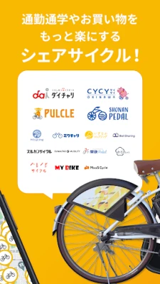ご利用いただけるシェアサイクリングサービス:daicahri(ダイチャリ)/ベルシェアリング/SHONAN PEDAL(ショウナンペダル)/MY BIKE(マイバイク)/関鉄Pedal/みとちゃり/MaaS Cycle(マースサイクル)/SUNAUTUS MOBILITY(サンオータスモビリティー)/ハレノヒサイクル/PULCLE(パルクル)/いずなかシェアリング/スルガノサイクル/CYCY(サイサイ)/Hi!Cycling(ハイサイクリング)/ballooners cycle(バルーナーズサイクル)/ミクチャリ など