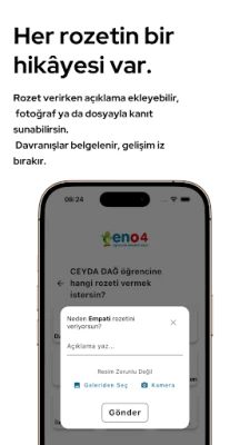 Öğretmenler, her öğrenciye günlük olarak pozitif ya da geliştirmeye açık davranışlar için özel rozetler verebilir. Her rozet, açıklama eklenerek neden verildiğiyle birlikte kaydedilir. İstenirse fotoğraf ya da dosya yüklenerek davranışa dair görsel kanıt eklenebilir. Bu sayede her rozet sadece ödül değil, gelişimsel bir belgeye dönüşür.