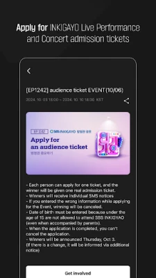 - You can apply for SBS Inkigayo tickets through My Page > Events > Apply.