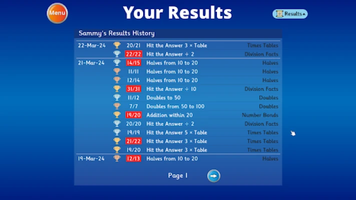 After each game, the score achieved is displayed along with the child's high score. Bronze, silver or gold stars and trophies are awarded depending on the score achieved in each game.
