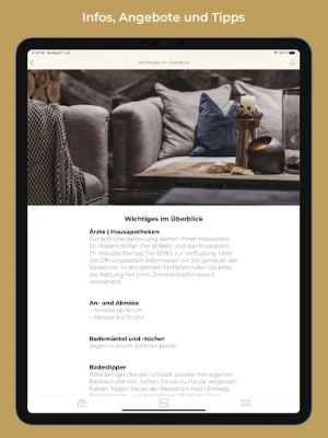Zudem haben Sie mit unserer App nützliche Adressen und Telefonnummern, Infos zum öffentlichen Nahverkehr sowie aktuelle Wetterprognosen immer auf Ihrem Smartphone mit dabei.