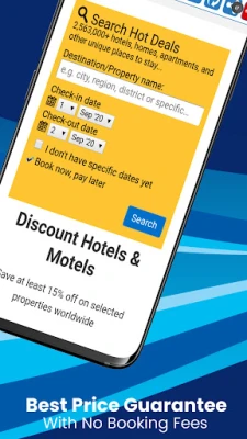 Our super easy to use hotel & motel booking app will find the best discounts on accommodation anywhere worldwide with free cancellation on most properties. From cheap last-minute hotel or motel deals to advanced hotel booking deals. You will find we have it all in one easy to use app. We find the best rates for you with zero booking fees or hidden charges and our best price guarantee. We also search rates for over 5 million properties worldwide at the best rates.