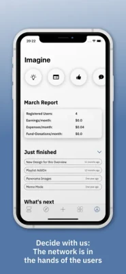 Our ideals are not a temporary mood of the founders, which are discarded with the first investor. All decisions about the future of Imagine, as well as the internal reporting and blocking procedures, are decided by the users. Each member is a part of Imagine and can decide for themselves how large this part should be.