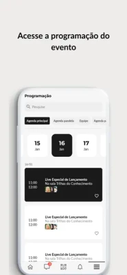 Além disso, você pode consultar a programação, avaliar conteúdos, dar feedbacks e responder quizzes.