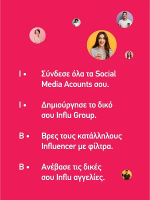 Σαν Influencer μπορείς να συνδέσεις τα Social Media Account σου, να δείξεις την συνολική σου δύναμη και να φτιάξεις το δικό σου Influ Group με τους φίλους σου! Ολοκλήρωσε την εγγραφή σου και ξεκίνα τις συνεργασίες!