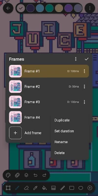 Inktica katmanları destekler, böylece pixel art çiziminizi düzenlemek ve belirli bölümleri daha kolay düzenlemek için bunları kullanabilirsiniz.