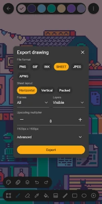 Çiziminizi tamamladığınızda, sosyal medyada paylaşabilir veya cihazlarınızın depolama alanına kaydedebilirsiniz. Dışa aktarılan görüntü, pixel art ile ilgili olmayan platformlarda bulanıklığı önlemek için büyütülebilir.