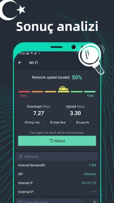 Tek bir dokunuşla, internet bağlantınız, dünya çapında binlerce sunucu üzerinden sınanacak ve 30 saniye içinde doğru sonuçları gösterilecektir.