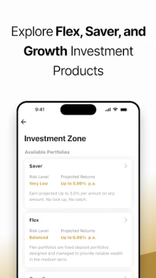 Our intuitive app allows you to start investing in minutes, with simplified options for all experience levels. Choose from our range of curated plans - Saver, Flex, or Growth - to match your investment goals and appetite for returns.