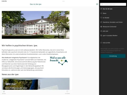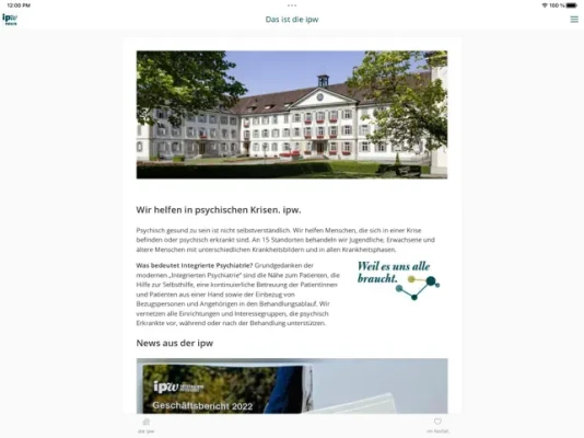 • Finden Sie für psychiatrische Notfälle die richtigen Kontakte. • Erhalten Sie alle Informationen zu Standorten, Kontakten und Öffnungszeiten. • Lesen Sie die aktuellen News über die ipw und Infos zu Veranstaltungen. • Menüs und Öffnungszeiten unseres Restaurants im Schlosstal.