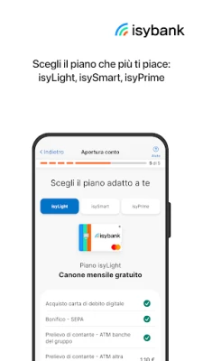 - Ti registri in pochi passaggi, scegli il piano più adatto a te tra isyLight, isySmart o isyPrime entri in app e hai subito il tuo conto attivo;