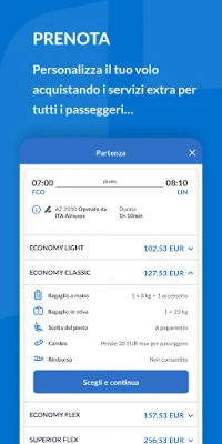 Gestisci la tua prenotazione con la possibilità di acquistare servizi aggiuntivi come la scelta del posto, bagagli aggiuntivi e la lounge per rendere l'esperienza ancora più confortevole.