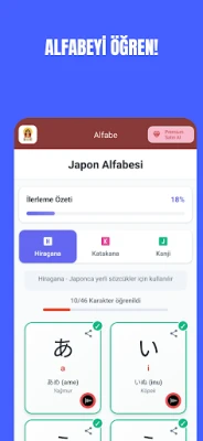 Japon alfabesini öğrenmek artık çok daha kolay! Hiragana, Katakana ve temel Kanji karakterlerini sesli telaffuzlarla, görsellerle desteklenmiş şekilde öğrenebilir, dilin temellerini sağlam atabilirsiniz.