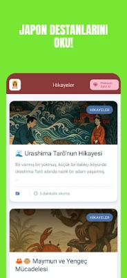 Sadece dil öğrenmekle kalmayın, Japon kültürüne de yolculuk yapın! Japonya’ya özgü masallar, halk hikâyeleri ve mitolojik anlatılar sayesinde hem dil becerilerinizi geliştirin hem de kültürel bilgi kazanın. Hikâyelerdeki kelimelere tıklayarak Japonca karşılıklarını anında görebilir, interaktif okuma deneyimi yaşayabilirsiniz.