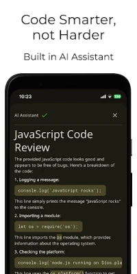 Lightweight app with full JavaScript syntax highlighting, code completion and editor actions like undo, redo, comment lines, and indent selection to enhance your developer productivity.