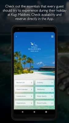 Explore Kagi Maldives Resort & Spa and its stunning facilities, plan your visit and activities from your device before and during your visit. Use this app to start planning your stay, and ensure you don’t miss-out on any of the incredible experiences on offer at Kagi Maldives Resort & Spa. During your stay the app provides the perfect travel companion, showing what’s on, providing you with fantastic inspiration from the recommended Must do list of experiences which you can book directly from the app. Your itinerary is always accessible to see what adventures you have planned.