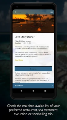 - Perfect your stay by booking restaurant experiences, excursions and activities such as snorkelling, scuba diving or to request to book spa treatments;