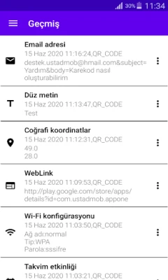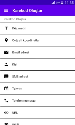 - Karekod (Metin,Coğrafi koordinatlar,Email adresi,Kişi,Sms adresi,Takvim,Telefon numarası,Url ve Wi-Fi) okuma ve oluşturma.