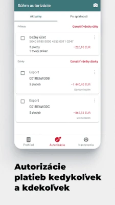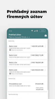 • autorizovať pripravené platby od účtovníčok • kontrolovať zostatky na účte/účtoch firmy • zobraziť upozornenie na platby čakajúce na Vaše schválenie • zobraziť informácie o Vašich ďalších účtoch • termínované účty • úverové účty