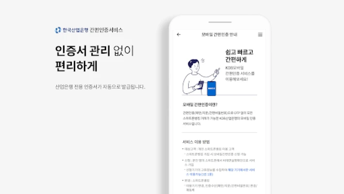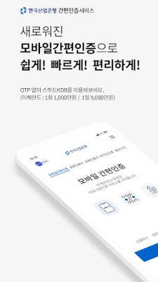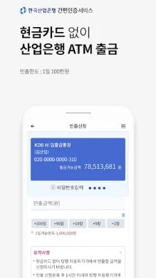 - 모바일간편인증 서비스 가입 고객은 스마트폰뱅킹에서 간편인출 신청 후 현금카드 없이 산업은행 자동화기기에서 소액인출(1일 100만원 이내)이 가능합니다.