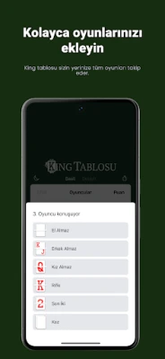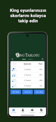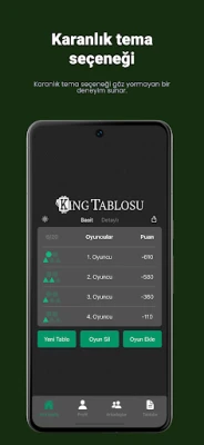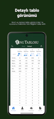 King iskambil oyunu için geliştirilmiş skor tablosu uygulaması oyun esnasında kolayca puanlarınızı kaydedebilmenizi sağlar. Basit ve detaylı görünüm özelliği ile anlık olarak oyuncuların puanlarını gözlemleyebilirsiniz. Kullanıcı dostu tasarımı, açık - koyu tema seçimi gibi pek çok özellikle oyun esnasındaki deneyiminizi arttırır.
